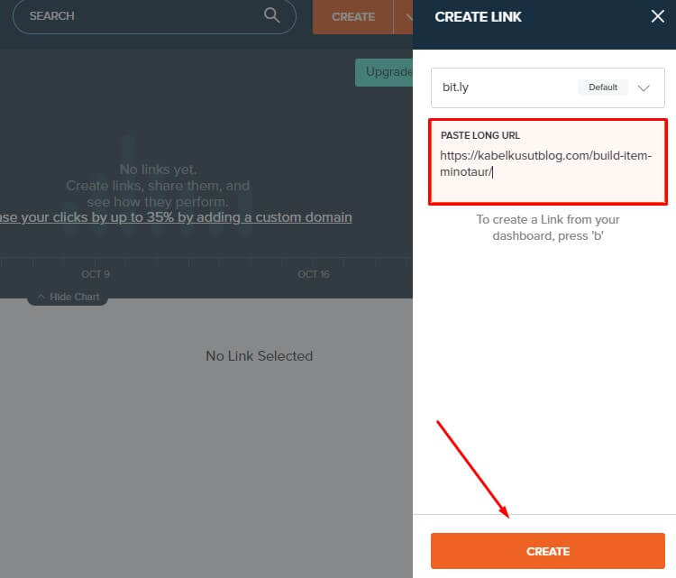 • Selanjutnya paste kan link yang ingin kamu perpendek menggunakan bitly dan kemudian klik pada bagian CREATE.